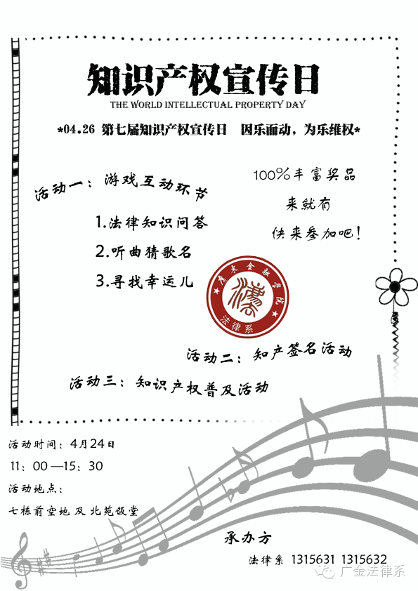 在七栋教学楼前和北苑饭堂空地举行第七届知识产权宣传日活动。我们诚挚邀请您出席本次活动。